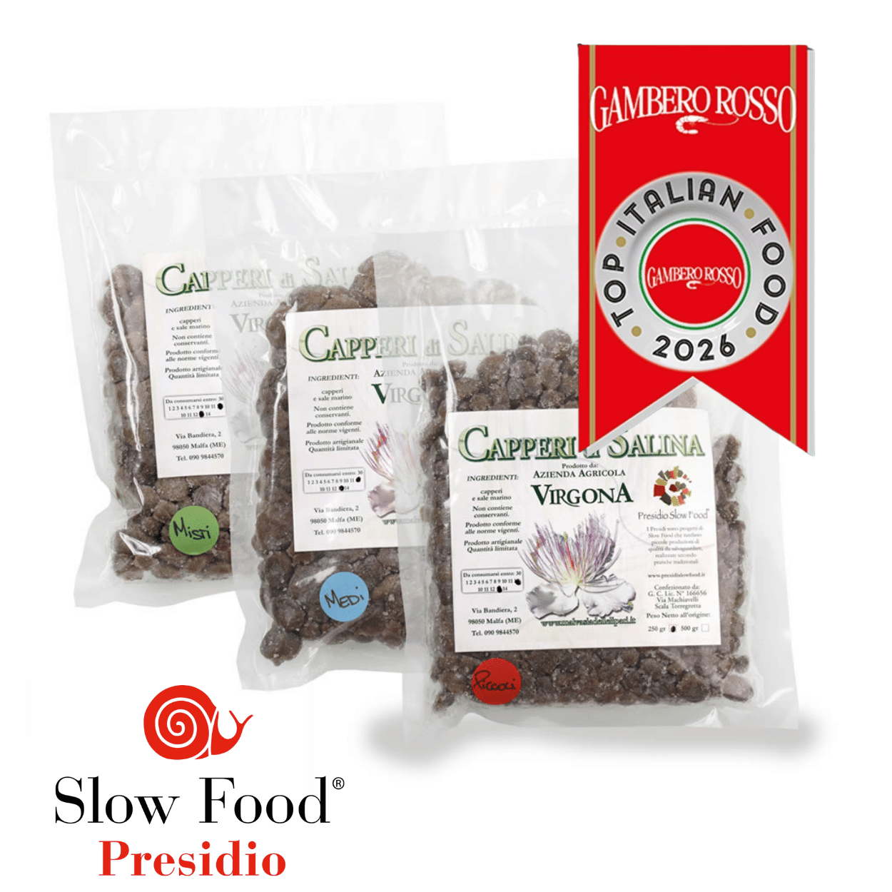 Winners of Gambero Rosso's Top Italian Food 2024 and 2025 awards and a Slow Food Presidium , theSalina capers from Azienda Agricola Virgona are hand-picked between May and July, selecting the firmest buds of the tondina variety . After being laid out on jute sheets , they are salted raw with coarse sea salt using a traditional method that enhances their firmness and marine aroma. With their intense and authentic notes , they bring the gastronomic excellence of Sicily to the table. The small buds, with their explosive flavor and firm texture , are perfect for finishing salads , canapés , and creamy sauces with a touch of refined lightness.